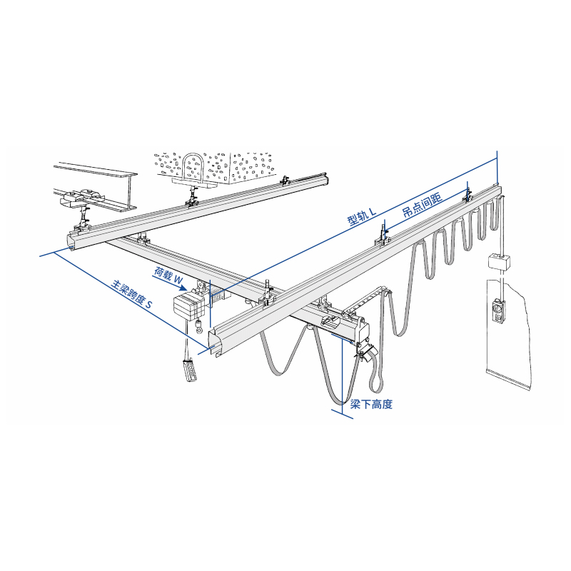 ·Wysokość belki: Odnosi się to do wysokości głównej belki, na której wózek jest zawieszony na wciągniku (w przypadku konstrukcji wolnostojących jest ona zwykle obliczana na podstawie punktu podparcia podłoża lub kolumny).